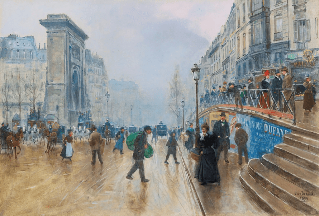 Jean Béraud masterfully depicts the lively charm of Parisian life in the late 19th century. Renowned for his vibrant street scenes, he combines meticulous detail with an impressionistic touch, portraying elegantly dressed figures amidst the bustling city.