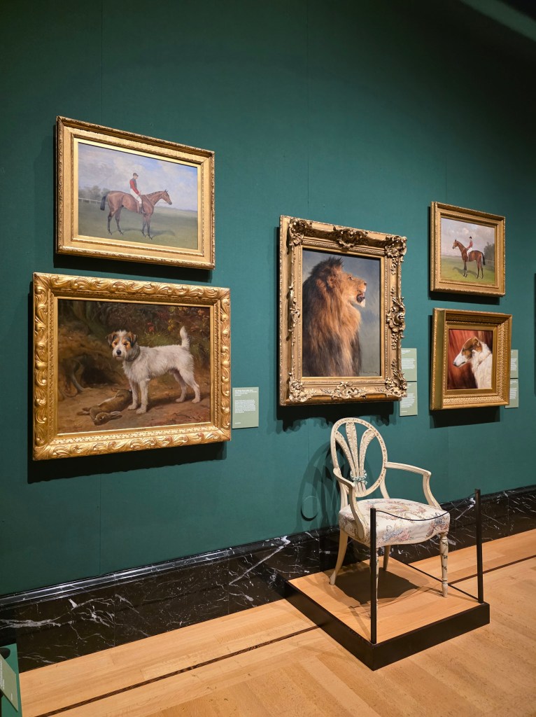 In the first gallery, vibrant animal paintings framed in gold—horses, dogs, even a majestic lion—greet visitors warmly. Every brushstroke reveals the period’s fascination with animals and the natural world. Nearby, a delicately crafted chair highlights how artistry extended even to furniture design.