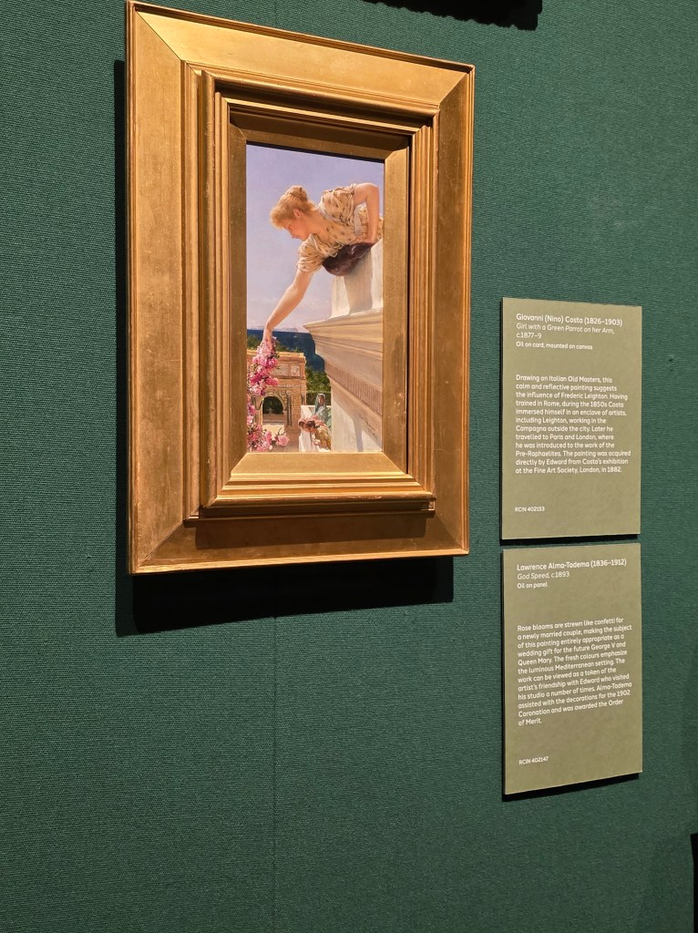 A more intimate room features a pastel-hued canvas of a woman, gently leaning among blossoms. Romantic and delicate, this painting captures Edwardian ideals of feminine beauty and sensitivity.